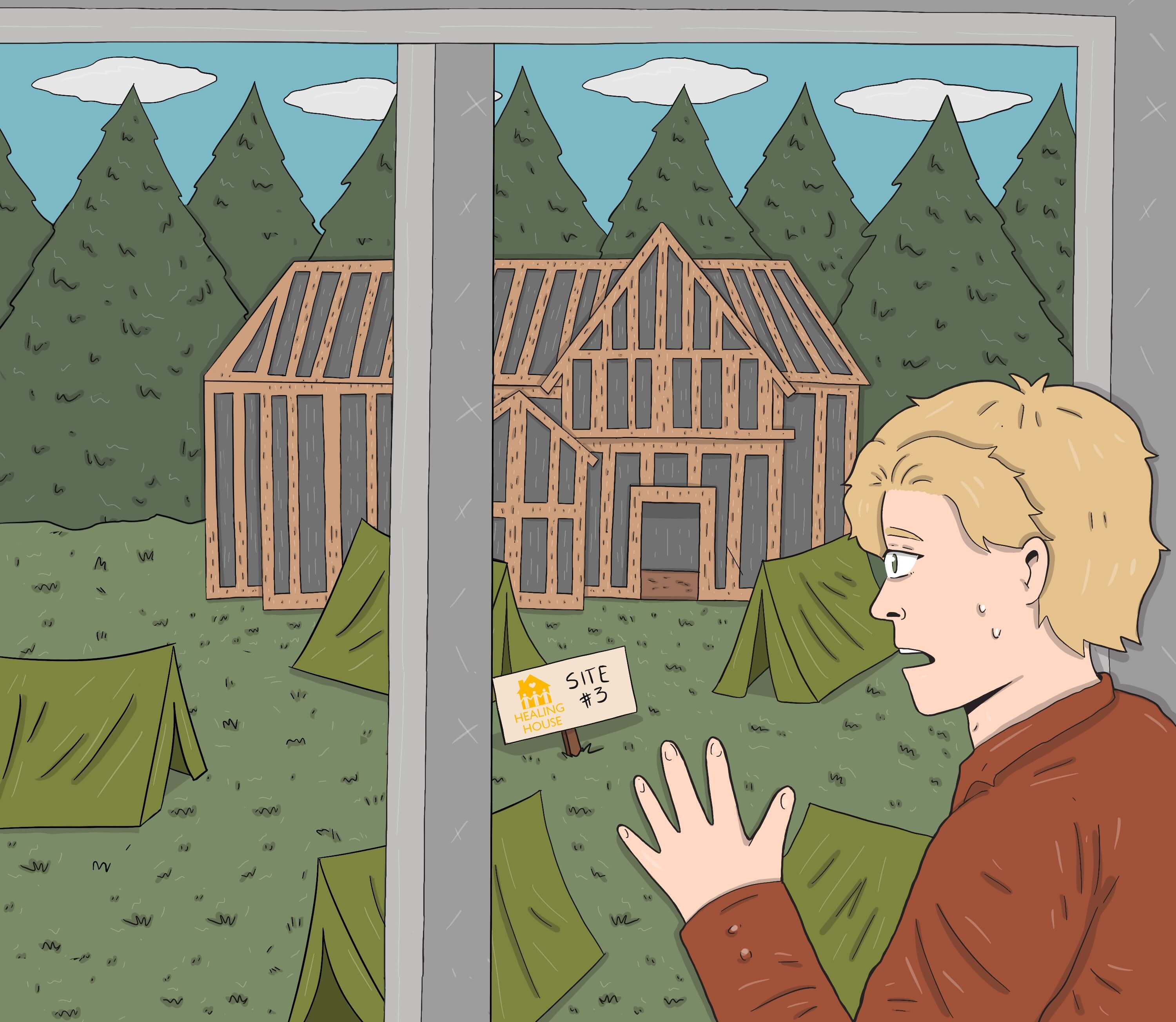 The bus finally comes to a stop in front of a collection of ugly, green tents and a small, painted wooden sign reading, “Healing House Site 3.” Behind them is a huge wooden frame of a mansion where only a few of the walls are complete.