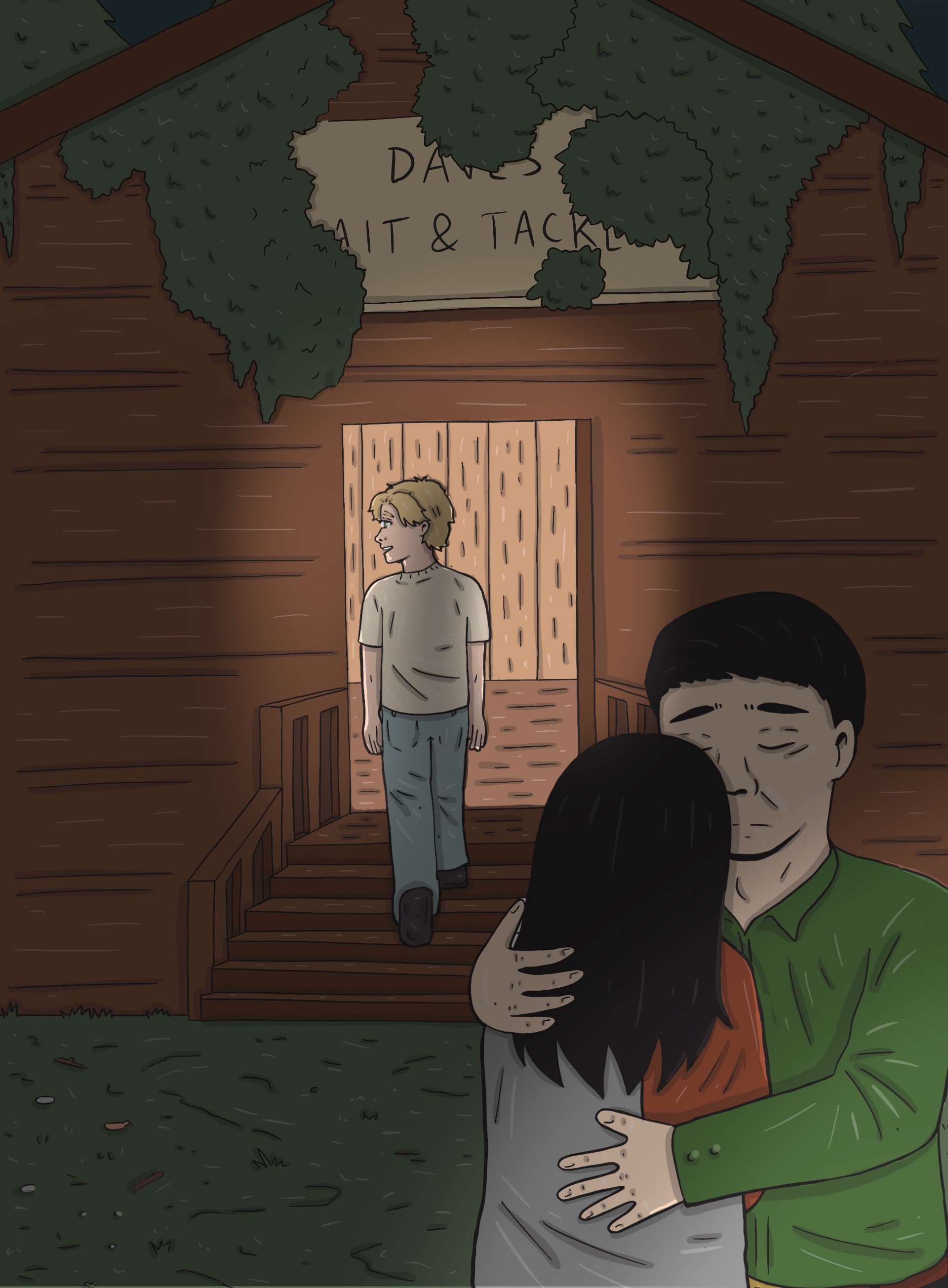“The sign says ‘Dave’s Bait and Tackle,’ but I can barely read it with all the moss on the building. I don’t think anyone’s here,” Nate says to Camila as they reach the front door.