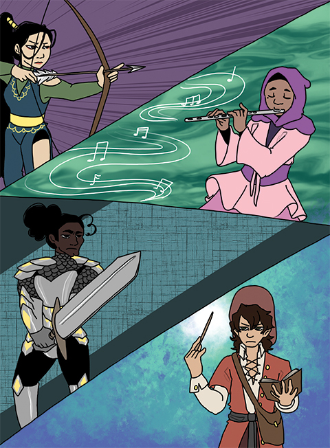 “Stand up, heroes! Sir Lancer, the highest-ranking swordsman in the land. Lady Artemis, the most accurate bow fighter in the land. Miss Marion, the best musician in the land, and Shay, the wizard who is always practicing to become stronger.”