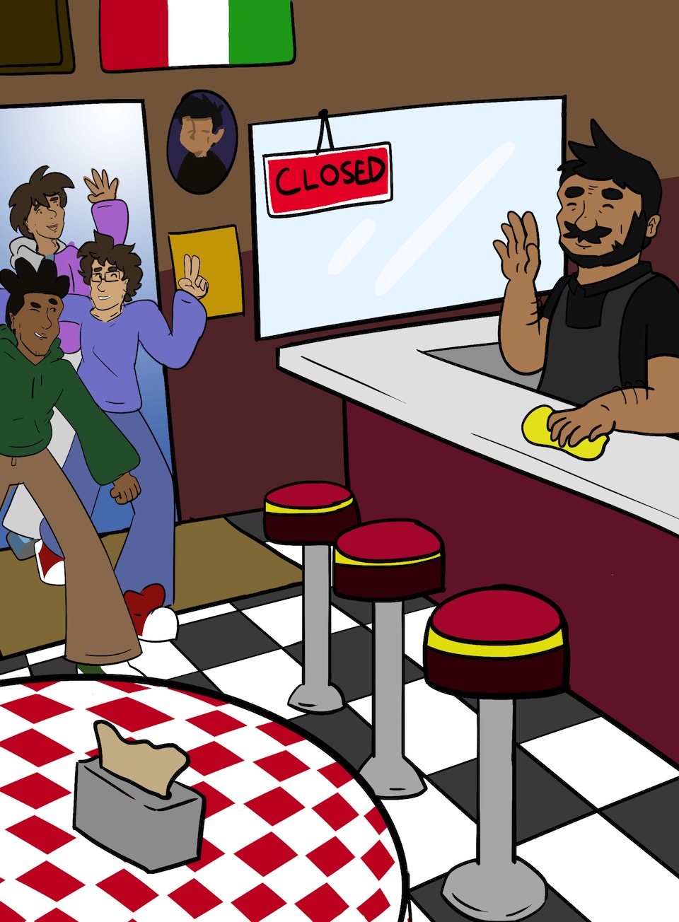 The man glared at us before his gaze landed on Mario behind the counter, who seemed unusually nervous.