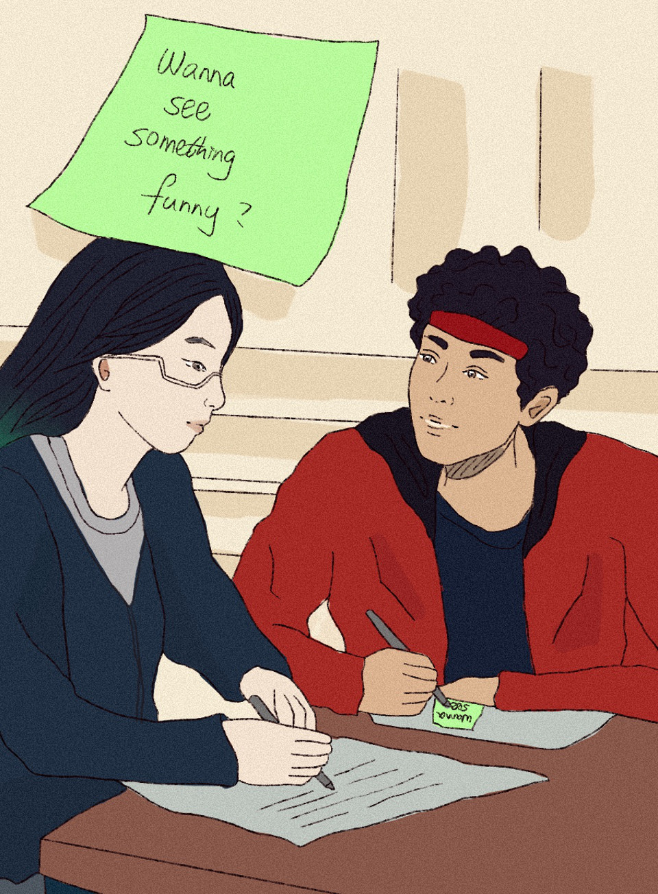 Reggie took out a slip of paper from his backpack. He started writing on it and passed it to me. The note read: