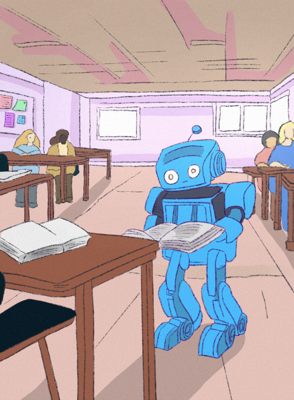 The robot hid behind an empty desk; then, it dropped the textbook, which hit the floor with a loud thud.