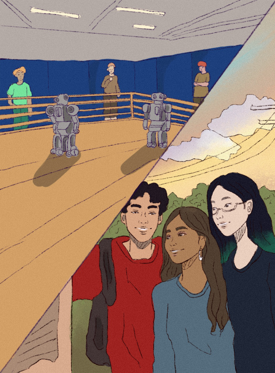 As the weeks passed, our after-school sessions became intense, with everyone perfecting their robots. My teammates were most concerned about the final round of the national competition: the showdown. We practiced battling each other in a small sparring ring.