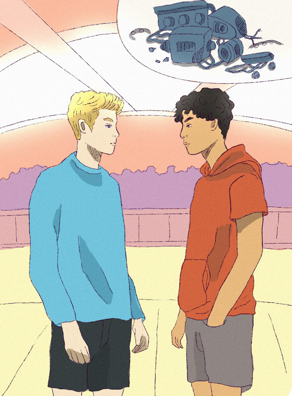 We all walked to where Griffin’s robot was kept. Sure enough, Griffin’s hard work had been destroyed. Pieces of metal and plastic were scattered across the floor. Griffin stared at Reggie.