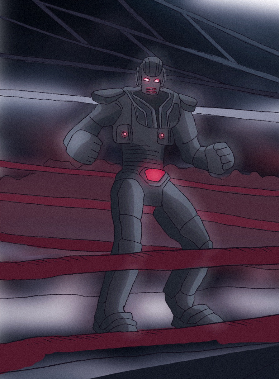 Soon, Bubblegum and I were making our way to the official sparring ring. I saw the robot I was fighting against. It was a black robot with glowing red eyes and big metal fists.
