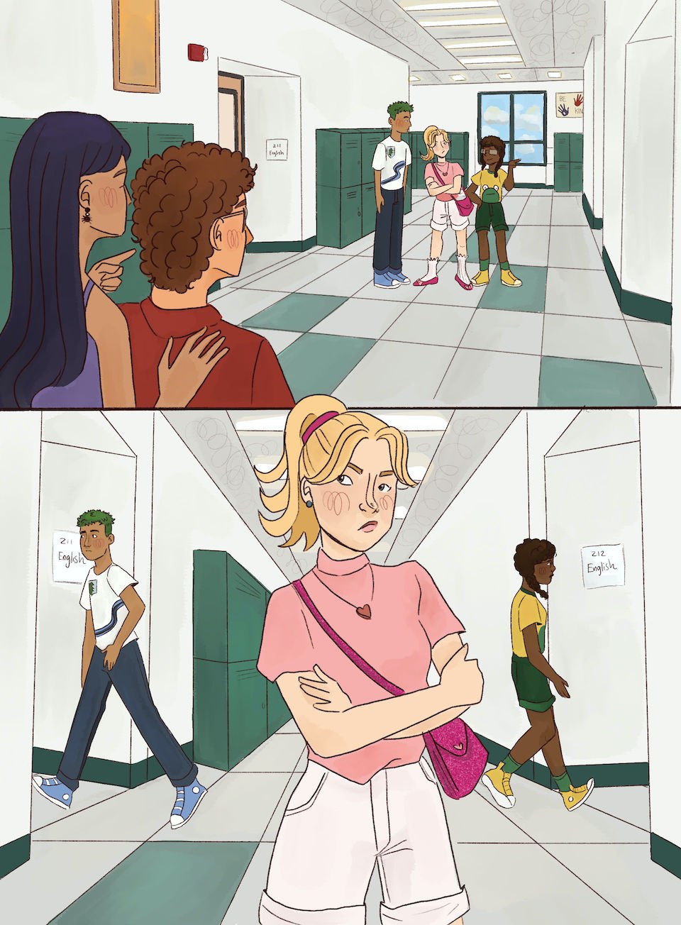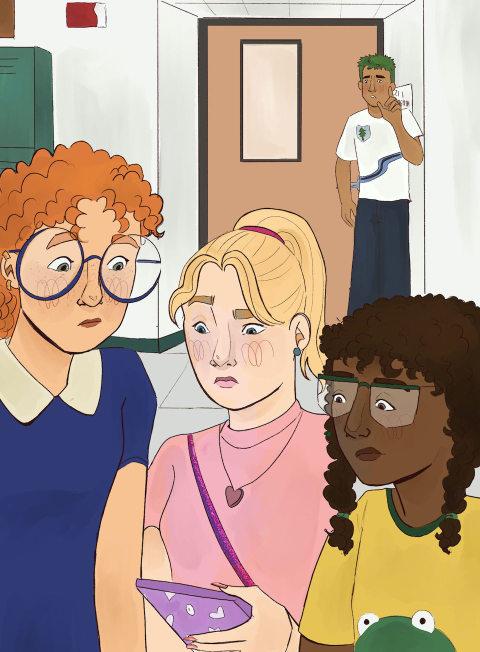 “Look,” she said, pointing down the hallway. Tiana and Peter were entering two different classrooms. Claire was standing at the front of the hallway with her arms crossed, blocking everyone’s way.
