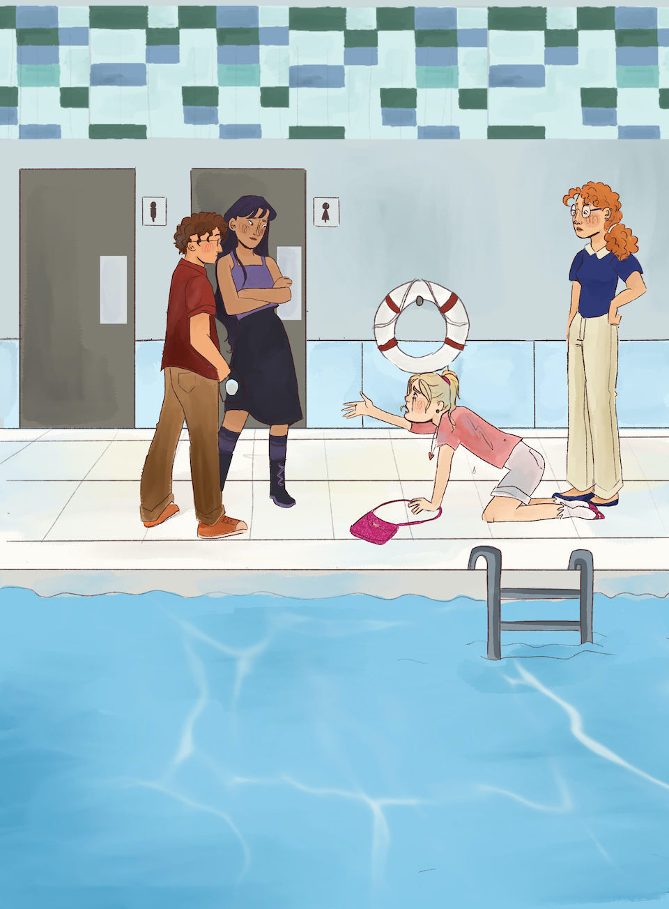 He reached the bag first, and when he grabbed it, Claire screamed. Andrew turned and swam for the side of the pool, where Marie and Penelope stood.